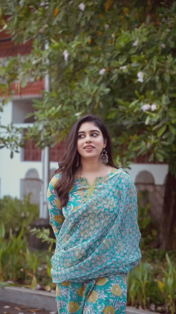 This gorgeous women's blue floral cotton suit will add flair to your ethnic outfit. Perfect for everyday wear, special occasions, or office style, this handcrafted suit set is made from breathable, premium cotton fabric and has beautiful floral designs and a lightweight dupatta. Wear this essential piece of traditional Indian clothing to embrace comfort and style. All sizes are available. Purchase today online with simple returns and quick delivery.