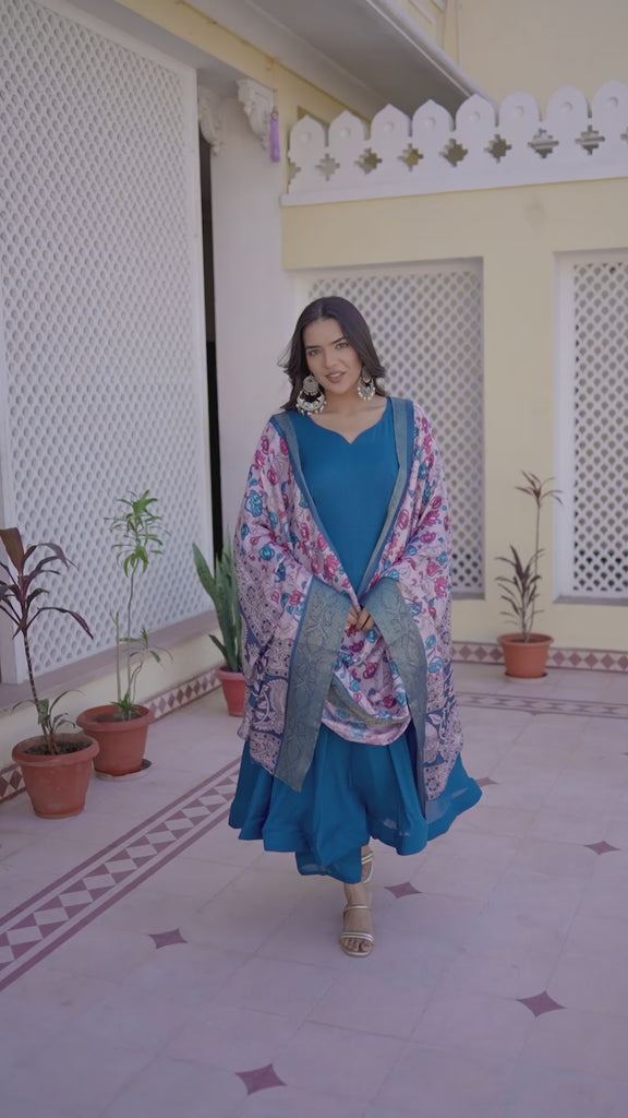 Elevate your ethnic wardrobe with this exquisite Anarkali suit set, designed to capture timeless elegance. The gracefully flared silhouette of the Anarkali kurta flatters all body types, while the intricately crafted piece showcases traditional craftsmanship. Paired with coordinating bottoms and a stunning floral-printed dupatta, this ensemble offers versatility for festive occasions, celebrations, and cultural events. The dupatta's vibrant botanical motifs add dimension and movement to your look. Perfect for those who appreciate authentic ethnic fashion with contemporary appeal, this suit set combines comfort with sophisticated style.