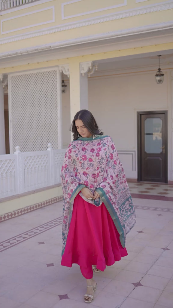 Transform your festive look with this stunning pink flared kurta set that seamlessly blends traditional artistry with modern elegance. The beautifully flared kurta flatters every silhouette, while the exquisite Kalamkari-style floral dupatta adorned with shimmering zari borders commands attention. Whether you're attending weddings, celebrations, or special gatherings, this ensemble delivers the perfect balance of comfort and sophistication. Invest in a piece that celebrates authentic Indian craftsmanship and timeless style—a versatile addition that elevates your ethnic collection and ensures you stand out with grace and confidence.