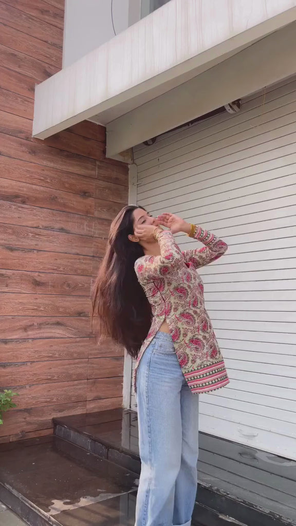 Elevate your wardrobe with the Everyday Elegance Block Print Sweetheart Neck Short Kurta in sage green. Crafted from breathable cotton, this kurta features a timeless paisley design in pink and maroon, highlighted by a flattering sweetheart neckline and full sleeves finished with contrasting striped cuffs. Combining traditional artistry with contemporary style, it offers all-day comfort and versatility, making it ideal for both professional settings and casual occasions.